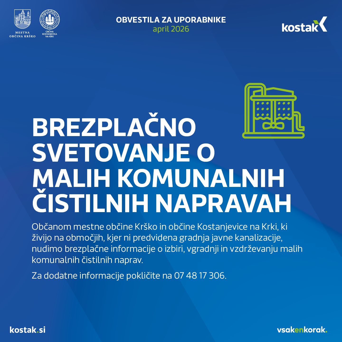 Za občane mestne občine Krško in občine Kostanjevica na Krki nudimo brezplačno svetovanje o izbiri, vgradnji in vzdrževanju malih komunalnih čistilnih naprav. Za dodatne informacije pokličite na 07 48 17 306 ....