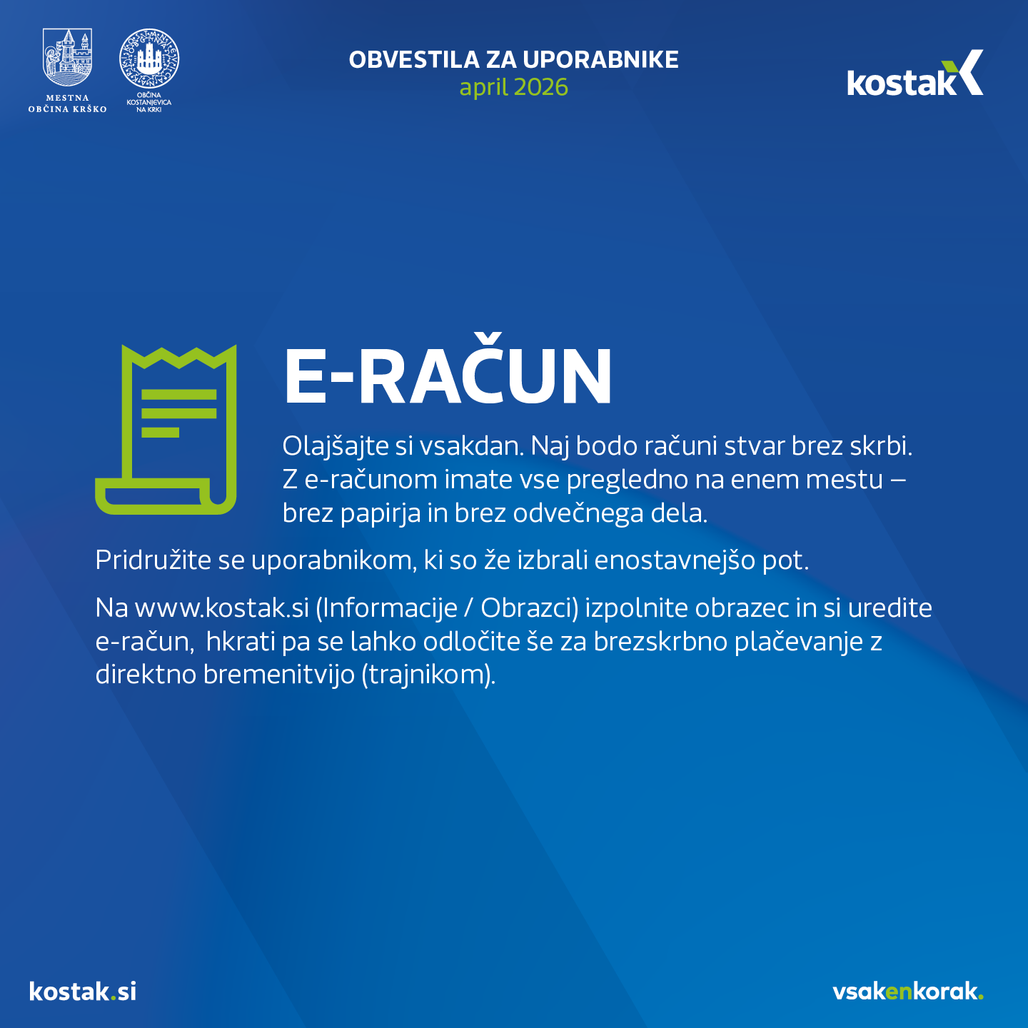 Olajšajte si vsakdan. Naj bodo računi stvar brez skrbi. Z e-računom imate vse pregledno na enem mestu – brez papirja in brez odvečnega dela. Pridružite se uporabnikom, ki so že izbrali enostavnejšo pot. Povezava do obrazca - Soglasje za prejemanje e-računov in direktno obremenitev SEPA Ta je tudi dostopen na spletni strani www.kostak.si (Informacije / Obrazci) - izpolnite obraze....